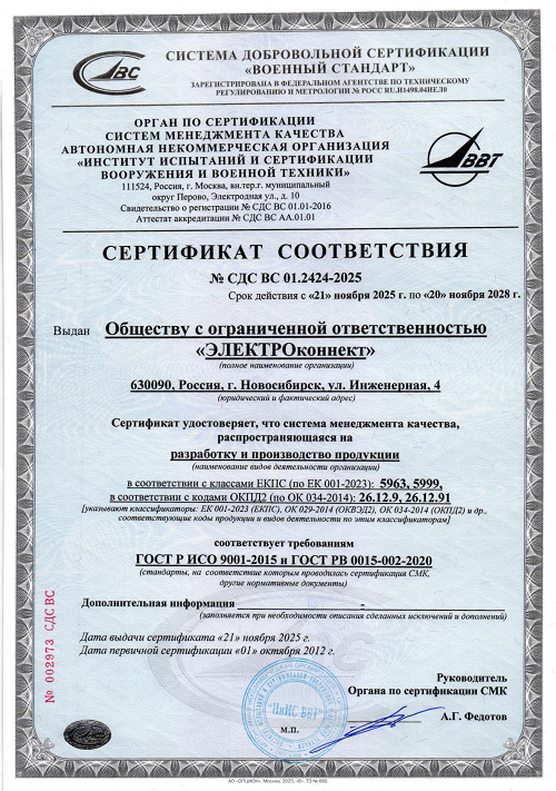 ООО «ЭЛЕКТРОконнект» своевременно подтверждает качество продукции и соответствие системы качества требованиям «Военный регистр». С момента получения сертификата качества не было случая приостановки его действия.